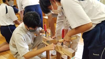 けがき(しるしの付け方)や、のこぎりの使い方を教えることで、中学生の皆さんは安全で楽しく製作しているようでした。高校生たちにとっても人に教える経験は、コミュニケーション能力の向上や自らの技術力の見直しなどたくさんの効果があります。中学生の皆さんから「楽しい」や「できた」の声を聞くと高校生はさらに技術を高めなくてはと意識が上がったようです。
