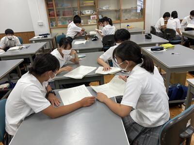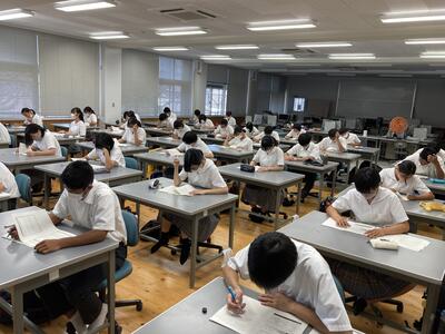 例年あしきた青少年の家で行われている学習合宿にかわり、2年特進クラスの生徒たちは2日間にわたって校内での特別講義を受講しました。初めて経験する大学入試問題に打ちひしがれた生徒もいたようですが、進路目標達成のためにあと1年半でどれだけのレベルアップが必要かを実感できた2日間でした。最後には現在大学に通っている本校卒業生に協力してもらい、オンライン座談会を開催しました。コロナ禍の大学の様子、受験生活の苦労や勉強のモチベーションを上げるためのアドバイスをもらい、生徒たちは勇気づけられたようです。夏休みはまだ始まったばかり。自分自身の成長のために1日1日を大切に過ごしてほしいと思います。