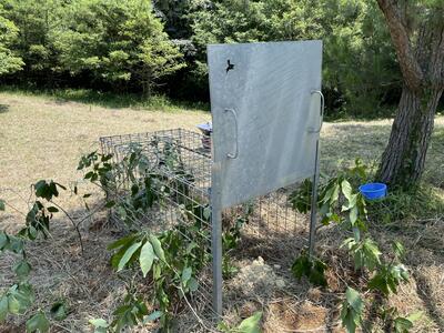 鏡山演習林を視察させて頂き、シカによる木々の食害の深刻さを目の当たりにしました。イノシカハンターズはシカの捕獲実績がなかったので、捕獲実績のある林業ハンター班さんにエサの撒き方や罠の設置方法を教えて頂き、箱罠を設置しました。箱罠には、扉が閉まったことを知らせるセンサーを付けただけではなく、くまもと☆農家ハンターさんが管理しているクラウドシステム「ファームキャプチャー」も使用し、箱罠の管理を行います。「ファームキャプチャー」は、動物が近くを通ると仕掛けてあるカメラで撮影し、その画像をスマートフォンやパソコンで見ることが出来るシステムです。