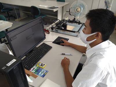 まず先週の実習で加工機のソフトの使用方法を学び、パソコン上にデザインを入力していきます。1年生それぞれがデザインを考え、それをプレゼンし、1番評価が高かったデザインを採用しました。