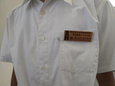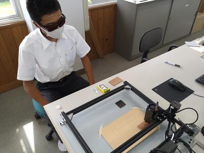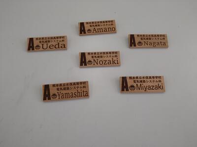 今日はその決めたデザインにそれぞれの名前を入力し実際にレーザー加工を行います。ちなみに名札は、桜の木です。少しピンクがかっていてとてもいい感じです。レーザー加工中は火災などの可能性があり危険ですので、機械から目が離せません。光が強いため、専用のゴーグルを使用しています。レーザー加工後は、やすり掛けをして角を丸くし、専用の金物を背面に取り付け、完成です。おそらくこの実習は県内初の取組みです。今後この名札を着用した、現場見学を企画します。