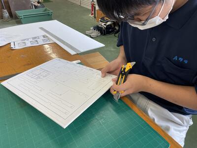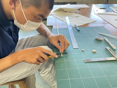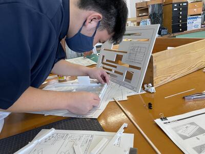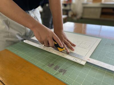ひのき棒、スチレンボードをカッターやのり、ボンドを用いて図面通りに加工、組み立てしていきます。生徒たちは、仲間と相談しながら作り上げていきます。上手くいかない、分からないところは、積極的に周囲に尋ねる雰囲気がとても良いです。まるで建築現場のように活気に溢れています。続きは来週。完成できるようみんなで楽しんで取り組みます。