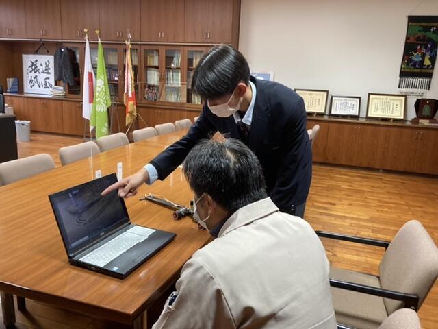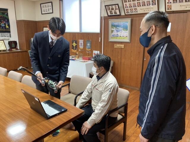 同窓会会長の澤村様が来校され、マイコンカーラリー全国大会に出場する3年6組電気コースの山下航さん(緑東中出身)に激励を頂きました。