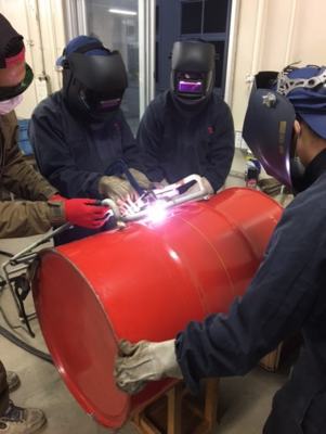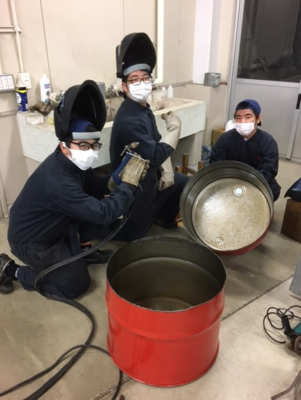 プラズマ切断機でドラム缶を切断します。切断部分は30A(アンペア)大電流を流し、3000℃くらいになり溶けた部分を圧縮空気で吹き飛ばします。