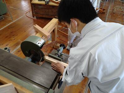 2年生は今クラスメイトと協力し、みんなで一台の木製椅子(2人用)を製作しています。また、併せて年度末に計画している地元小学校への木工体験のための製材、加工も兼ねており、木製椅子10台分を加工します。