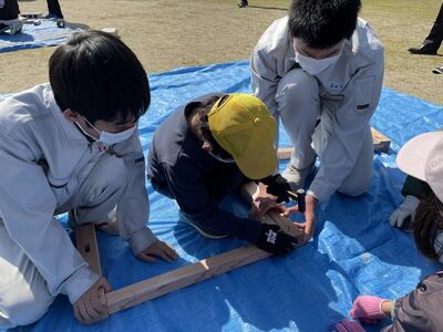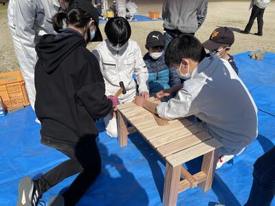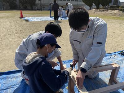 先日、建築コース1・2年生が、久木野小学校の1年生から6年生までの15人の皆さんに木製ベンチの製作のため、出前授業をさせてもらいました。生徒たちは、事前に材料の加工や組み立て方の手順の確認、アドバイスや声かけの練習をして臨みました。感染症対策もあり、運動場での作業で寒かったのですが、児童の皆さんは、積極的に取り組んでくれました。高校生もこれまで学んだ技術を活かせた上に、小学生の皆さんに喜んでもらって良かったです。