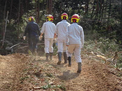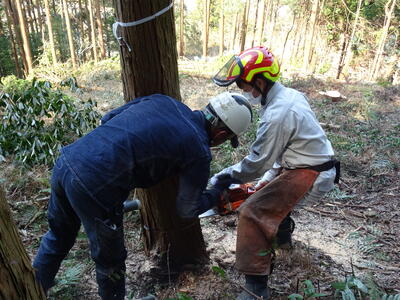 先日、建築コース2年生が、山林業者さんのご指導ご支援のもと、実際に山に入り、チェーンソーでの伐採実習を行ってきました。山は急斜面でかつ装備も重たく大変な作業でしたが、今まで様々な体験を積み、部活動でも鍛えた体力のある2年生は安全に作業ができました。さらに伐採方法のDVDを視聴し事前学習していたこともスムーズに実習できたことにつながりました。