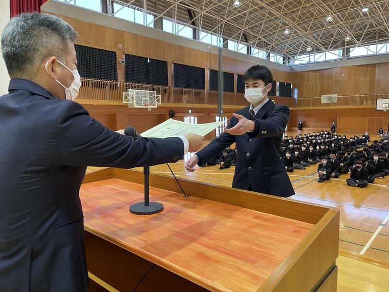 終業式では、鶴山校長より、「進路決定には相手(進学先・就職先)を知ることも大切だが、自分自身を知ることが大切であり、自分を知ることのほうがより難しい。自分を知るために、常に謙虚な姿勢で、異質なものとの触れ合いを大切にする。異質なものとは、読書であり、先達者である大人であり、学校で学ぶ勉強であろう。そうした経験を通じて、自分の将来を見つめてほしい。」とのメッセージが送られました。