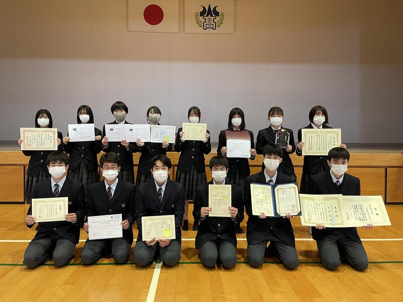 終業式に先立って行われた表彰式では、今回も多くの生徒が表彰を受賞していました。なかでも、58%の生徒が遅刻無欠席の皆勤を達成していました。あっぱれ水高生!