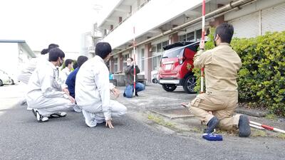 多くの実習がそうですが、測量はクラスメイトとの協力が必要です。まだ入学したてでみんなと話すのも恥ずかしい様子があった生徒も、同じ測量の課題に向かって協力しながら作業を進めると緊張がとれ、自然と笑顔に。みんなで目標に向かって動くと仲良くなれますよね。