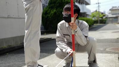 先日、建築コース1年生が初めての実習にチャレンジしました。新しい作業着と安全靴、そして少し緊張した表情。安全教育を受けて、さらに緊張感が高まります。今回の内容は測量です。敷地の形状や広さなどを計れるようになるため、用語や作業手順を学び、実際に測量をやっていきます。