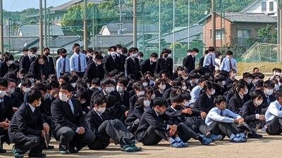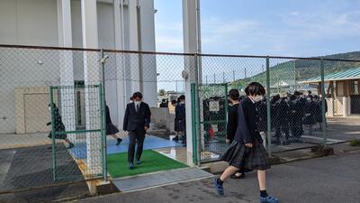 訓練の前には、教室で訓練の意義や避難経路、集合及び点呼について確認がありました。また、今回の訓練では出火先を職員、生徒に事前に伝えていません。生徒たちは訓練火災の放送が鳴ると、火災場所から適切な避難経路を選び、そして真剣かつ安全に避難をすることができました。集合や点呼についても、いつも集会などで訓練しているのでとてもスムーズです。やはり日ごろの積み重ねが大切です。