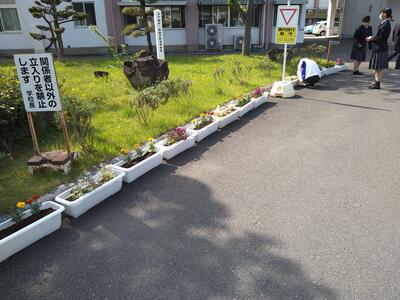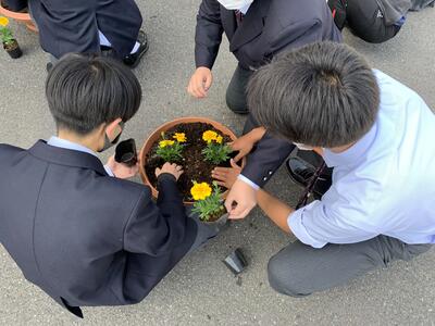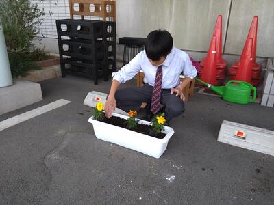 小嶋PTA会長より、学校がさらに明るくなるようにと花の苗を頂きました。今日の放課後、生徒会の生徒たちでプランターに移し替えました。生徒たちは、小嶋会長の想いに感謝しながら、とても大事に花を扱いつつ、笑顔で花を植えていました。プランターは正門入り口と昇降口に置きました。毎日通る道がとても明るくなります。