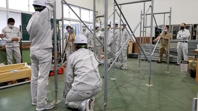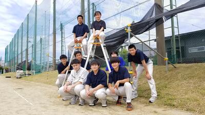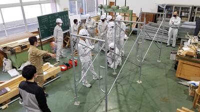 今回の2年生の実習は電気コースと合同で「足場の組立実習」を行いました。実は、毎年体育大会で制作される看板(2.7m×3.6mの団画)を飾るための足場や団席の日除けは、建築コースが中心になって、工業科の生徒が協力し合って設置しているんです。今回の実習は、建設現場で使用される足場について学ぶだけでなく、看板設置用の足場組立の予行も兼ねています。2年生のチームワークは抜群で、先生から教わったことを確実に実践しながら、全員で声を掛け合って安全に組立、分解ができました。体育大会では、力作の看板だけでなく、設置用の足場にもご注目ください。