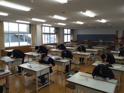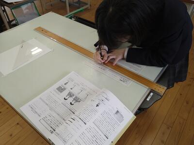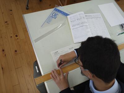 建築コース1年生は、製図の授業が始まりました。製図道具の名称を覚え、ペンの持ち方、紙の貼り方、定規の使い方を学んだ後は、線の引き方の練習を行いました。始めは、線の太さにばらつきがあったり、濃淡が出てしまったり、また時間がかかりすぎるなどありましたが、意識高くそして何度もチャレンジすることで確実に上達していきます。休み時間には、友人の課題の進み具合を見て、お互いの出来について話したり、コツを教え合ったりするなどとてもいい雰囲気です。