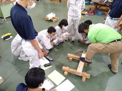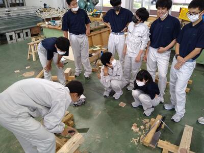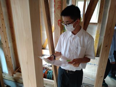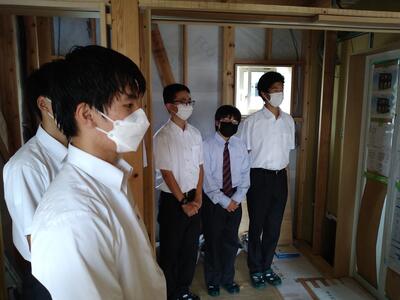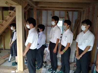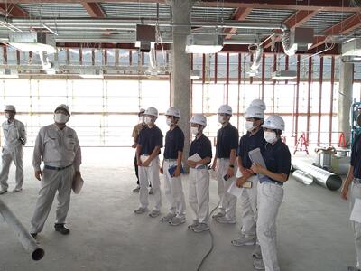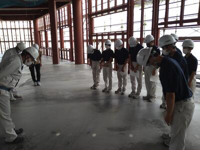 生徒たちは、現場監督の方に、丁寧でわかりやすく工事についての説明をしてもらい、メモを取りながら聞いていました。分からないことを積極的に質問する姿が見られ、技術者として成長することができたのではないでしょうか。最後に、建築に関する資格やその取得方法、現場での苦労についてなども話をしていただき、とても参考になりました。また今後も見学させていただきたいと思います。