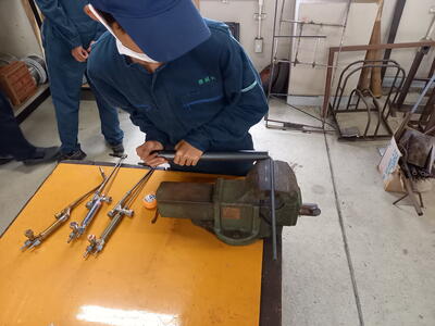 フレーム切断中!               曲げ加工!棒を刺して曲げやすく!
