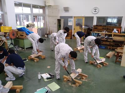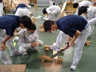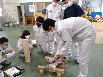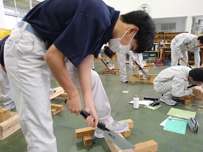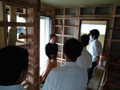 1年生建築コースは、2回目の現場見学に行ってきました。前回の見学から工事が進み、木の加工や壁の仕上げなどを見学しました。また今回生徒たちは、実際に作業の様子もみさせていただき、大工さんの技術の高さに驚いていました。さらに外部で左官さんも仕事をされており、それも見させていただきました。