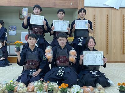 2日目の団体戦は2回戦から出場し、シードの芦北高校と対戦しました。先鋒が引分、次・中と敗れましたが、副・大と逆転し、結果2-2の取得本数差で勝利することができました。