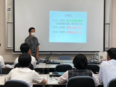 熊本学園大学に在学中の卒業生は、説明会の中で堂々と学生生活について発表をしてくれました。現在の学びの様子やこれからの目標や将来の夢など、しっかりと語っていました。学生生活を有意義に過ごしている様子が伝わってきました。東海大学に在学中の卒業生は、説明会終了時にわざわざ会いに来てくれました。就職も決まり、研究に打ち込む様子がいきいきとしていて、すてきな人になったなあと感心しました。