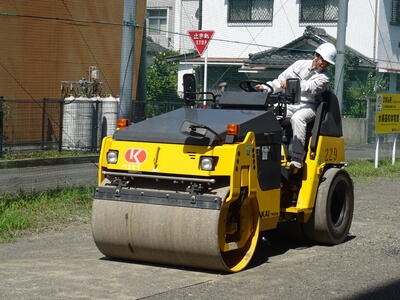 電気建築システム科では、卒業後に必要と思われる資格について、試験会場に行くのではなく夏休みなど長期休暇を利用して、本校内で行っています。生徒たちは、移動時間や旅費の負担もなく参加できます。また、事前に事務室と連携し、雨がふると水たまりができていた駐車場に砂利を入れておき、今回のロードローラー講習できれいに駐車場を締固めることができました。