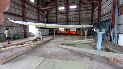クレーンを使い、12艇を艇庫内に一艇ずつ並べていきます
