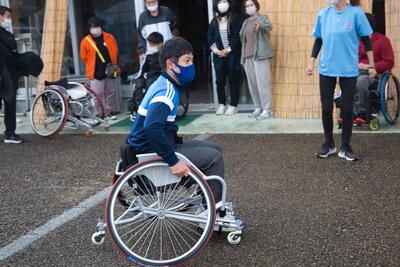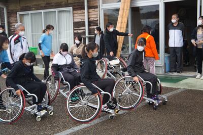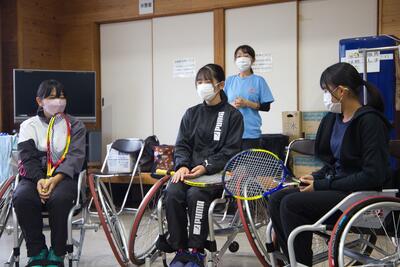 講師に千川理光さんが来てくださり車いすテニスでの練習方法や練習するうえで選手やコーチが気を付けることなどについてお話してくださいました。その後は雨のためテニスコートでの体験はできませんでしたが、実際に車いすに乗り、一通りの動きを体験した後に小さなラケットを持ってスポンジボールを実際に車いすに乗って打つという体験もしました。顧問も一緒にしてみましたが、なかなか咄嗟に動くことができませんでした。車いすテニスに触れることができただけでなく、テニスに向き合う姿勢についてもみな意識が向上した体験会となりました。