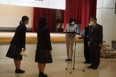 表彰式は代表一名ということで、2年の山﨑さんに出席してもらいます。