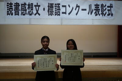福田さん(1年・普通科)、生嶋さん(1年・普通科)の2人は、読書感想文でともに優秀賞を受賞しました。読書感想文は、小学生の部、中学生の部、高校生の部、一般の部の作品を、標語は小中学校からの投稿作品を審査し、受賞した人がこの会で表彰されました。続いて、最優秀作品の朗読、審査員講評が行われ、会は終了しました。