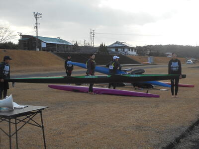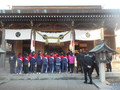 はじめに、参加部員約35人が一年のの安全祈願のため学校近くの水俣八幡宮へ参拝し、その後初漕ぎを楽しみました。