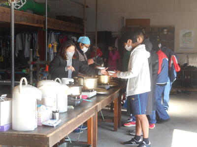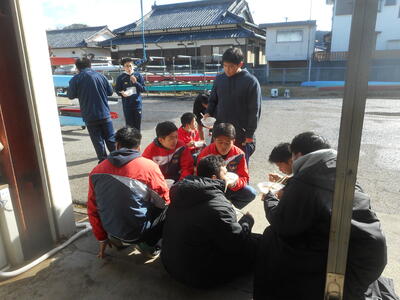 保護者会から炊き出しをしていただき、豚汁やぜんざいを食べて、練習後は体を温めました。
