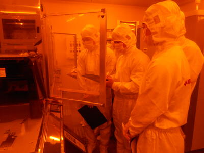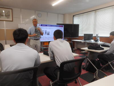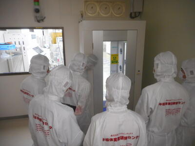 今回は第1弾として、機械科の3年生6名が課題研究で訪問しました。半導体製造装置が置かれたクリーンルームでの機器の動作や作業を見学しました。生活に不可欠な電子機器に使用される半導体がどのように生産されるのか、雰囲気を感じることができました。
