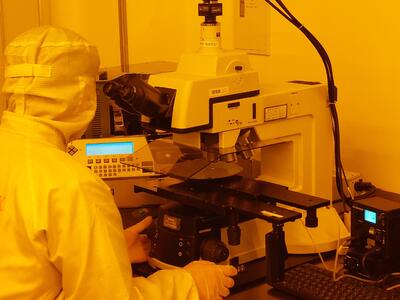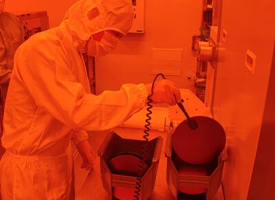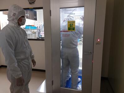 研修は、座学研修とクリーンルーム体験の2種類が行われました。座学研修では、半導体の使用例、材料、電子の振る舞いなど基本的な知識を副センター長の嶽本様より説明していただきました。クリーンルーム体験では、半導体ウエハーや電子回路の製造工程の体験をしました。