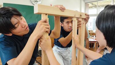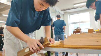 今日は、ものづくりマイスターの皆さんによる実技指導の最終日でした。3月に生徒自ら、山に入り、林業者の方のご指導の下、伐採した木を譲り受け、乾燥、製材して、マイスターのご指導のおかげで、ここまできました。