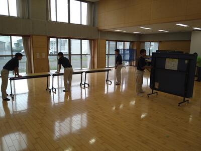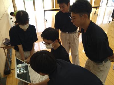 ドローン実習の3回目は、前回までの飛行訓練ではなく、プログラミング操作に挑戦です。まず、ミーティングルームで障害物となる机や卓球台を並べ、担当教師より飛行条件が示されました。最初にみんなで室内の距離や障害物の高さなどの計測を行います。そして、2班に分かれ、専用のソフトを操作します。離陸や旋回など必要な操作を条件に沿うように入力し、ドローンを飛行させます。1回目は、条件通りに飛行させることができませんでした。みんなで敷地の計測間違いがないか、指示の入力ミス修正や機械の特性(風などの影響で旋回の時に微妙に角度がずれるなど)を読み取り、試行錯誤しながらプログラムを修正していきます。