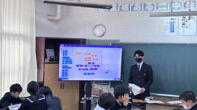 令和5年12月21日(木)に水俣第二中学校1年生の2クラスへプログラミングの出前授業に行きました。