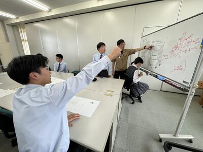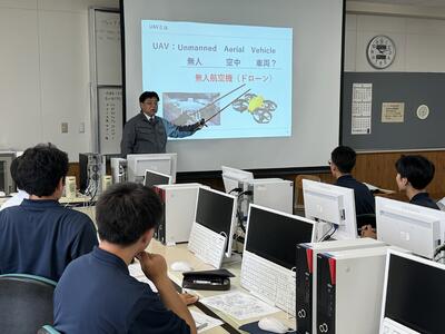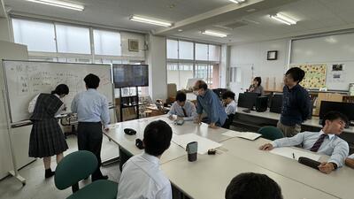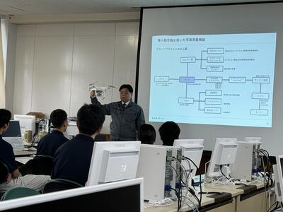 聞き慣れない専門用語等は、用意していただいた資料やプレゼンにより、理解を深めることができました。今日は雨天のため残念ながらドローンの実習はすることができませんでしたが、最先端の建設現場の話を学ぶことができました。授業後には、質問や講師の方と生徒、職員でディスカッションを行ったことで、さらに良いものになっていくことでしょう。DX推進プロジェクトの今後の活動に注目してください。