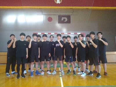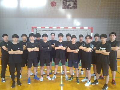 ハンドボール部は2年生選手が9人、1年生選手が6人、2年生のマネージャーが1名の計16名で活動しています。全員が高校から始め、さらに3年生がいない中での活動ですが、保護者の方の協力もあり、定期的に遠征や練習試合を重ね、力をつけてきています。高校総体では、チームスタイルの「連動と継続」、「組織力」を発揮して、3年生相手にもファイトし、勝利を目標にそして応援されるチーム、人になれるよう日々努力を重ねています。