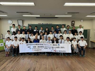 6月13日(木)に本校で先進的に建設DXを推進する株式会社KAWATSU(大津町)の技術顧問条谷貴志さん(兵庫県)に講演をしていただきました。講演会には、本校建築コース1~3年生及び職員の他に、建設業協会芦北支部(地元企業)と芦北地域振興局(熊本県)も参加しました。