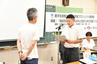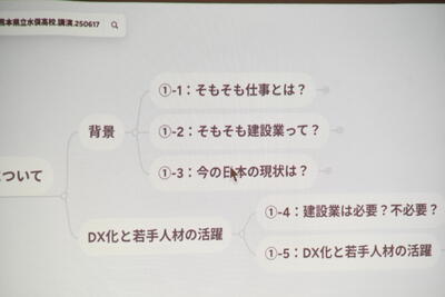 講演会では、「建設現場におけるDX化と若手人材の活躍について」というテーマで、建設業界の現状や課題、そしてDX(デジタルトランスフォーメーション)がどのように建設業を変えているのか、さらに未来の人材に求められることなど、分かりやすく教えていただきました。講演会の後は、ジョウ所長をはじめ、建設業協会、芦北振興局、そして水俣高校の校長先生と生徒がパネリストとして参加するパネルディスカッションも開催。建設DXのことだけでなく、仕事の面白さや女性の活躍など、たくさんのテーマで活発な議論が交わされ、あっという間に時間が過ぎていきました。参加した生徒たちは、さまざまな考えに触れて、たくさんの学びを得ることができたようです。