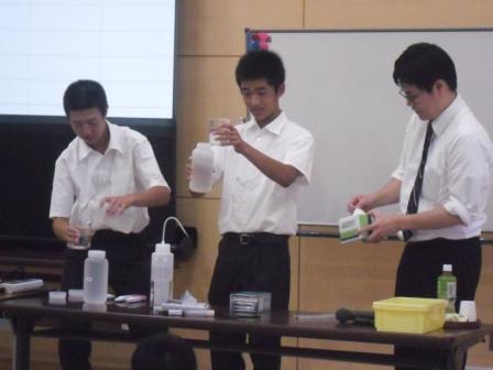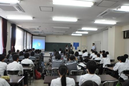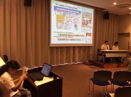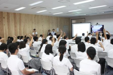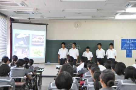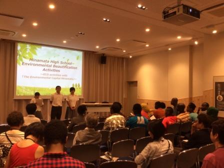 水俣病と環境の取組を学びに水俣を訪問した留学生を対象に、本校の生徒から環境美化活動の取組を英語で発表しました。高校でも高いレベルで環境保全の取組を実施していることに、留学生も関心を持って聞いていました。