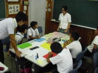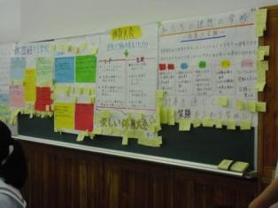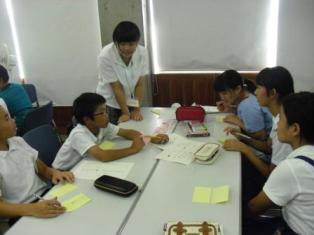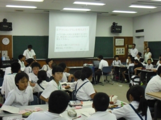 研修では、参加する小中学生を13班に分け、各班に本校生徒が1名ずつつき、班別協議の進行役となり、全体進行および班のとりまとめを行いました。班別協議では「理想の学校を作ろう」をテーマとして、自分たちの学校を魅力的な学校とするための施策・目標およびその目標達成のための具体的な方策を考え、それを1枚の紙にまとめプレゼンテーションを行いました。