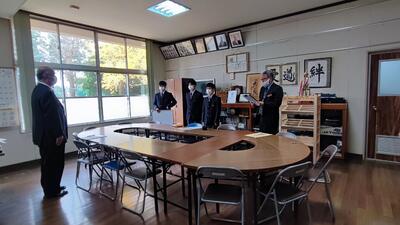 校長先生からは、贈呈式前に校長室で一緒に撮影した写真を、帰るときには印刷してもらい、本校生にプレゼントしていただきました。本校生にとってとても良い思い出になりました。このあと、他の市内中学校にも贈呈させていただきます。