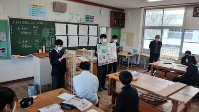 建築コース3年生から、袋中学校の生徒さんたちへ建具パンフレットラックを贈呈させていただきました。2年生の技術の時間に訪問させてもらい、そこでプロジェクトの概要や贈呈品の説明をしました。袋中学校代表の生徒さんからは、「水俣の山や木に関心を持ちたい、ラックを大切に使います。」と言葉をいただき、大変嬉しかったです。