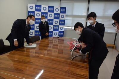 髙岡市長様からお祝いの言葉をいただきました。「日本一はこれまでの先輩から受け継いだ結果であり、とてもうれしいです。動画よりも思ったよりピンクの機体なのですね。機会があるならば小中学生に向けてプールの中で実演するなど、技術を披露する機会があるといいな、と思います。」という激励でした。これからもいただいた3Dプリンタで様々な作品を製作したのしいものづくりを展開していきたいと思います。お忙しい中、御対応いただきましてありがとうございました。