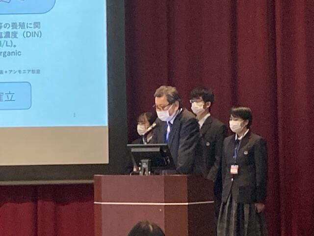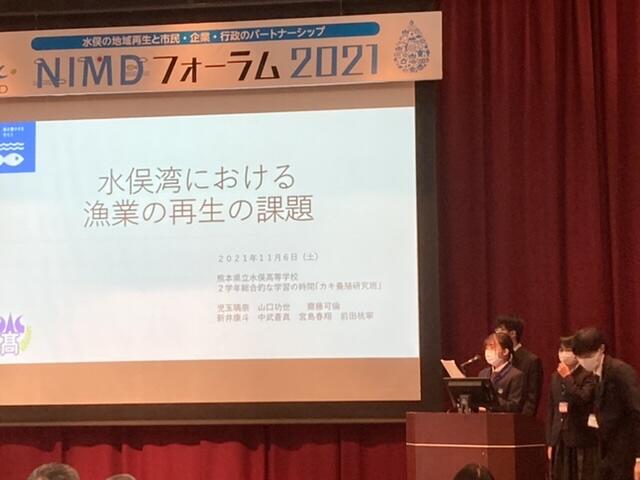 11月6日(土)、環境センターでNIMD(国立水俣病研究総合センター)フォーラムが開催され、2年生普通科の探究牡蠣班3人(山口さん、児玉さん、斉藤さん)が発表しました。水俣高校がこれまで国水研の松山明人様のご指導と水俣漁協の皆様のご協力を受け進めてきた6年に渡る水俣湾をフィールドとした研究を発表しました。