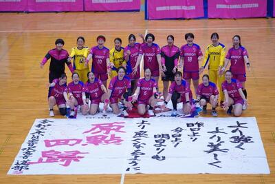 先日行われた「第46回日本ハンドボールリーグ山鹿大会」では、進呈した作品がお披露目されました。