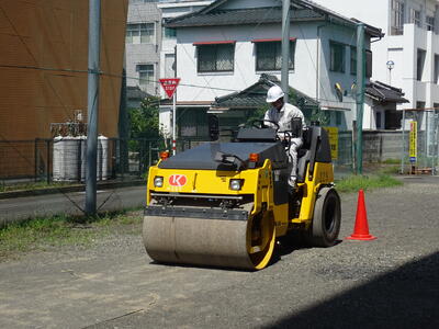 8月3日、4日に電気建築システム科2・3年生の希望者10名が本校で、労働安全衛生法による締固めローラー特別教育を受講しました。講師の方に来校していただき、初日は講義、二日目は実技の日程でロードローラーの操作は体育館駐車場で実施しました。