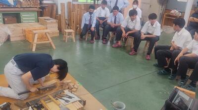 見学時間は2時間で、電気工事と木材加工を交互に見学する形でしたが、1、2年生たちは、先輩の職人技に感動と憧れを抱いていました。