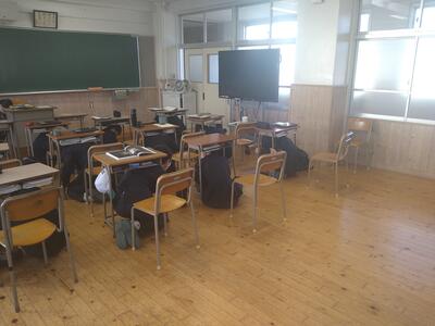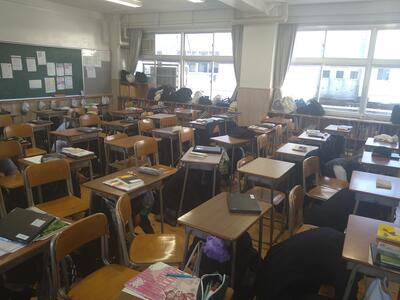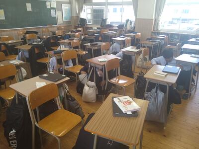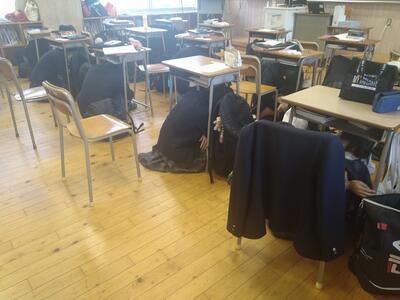 生徒へは事前に告知していませんでしたが、訓練放送が流れると、落ち着いた様子で、低い体勢で机の下に入り、頭を守り、動かないという3つの安全確保行動ができていました。
